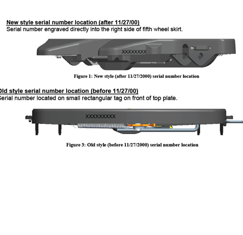 The first digit (XXXXXXXXX) indicates the plant in which the product was assembled. The second, third and fourth digits (XXXXXXXXX) indicate the Julian date (day of the year) the product was produced. The fifth and sixth digits (XXXXXXXXX) indicate the year. The seventh, eighth, and ninth digits (XXXXXXXXX) indicate the sequence of the fifth wheel in the quantity produced in a given day.
